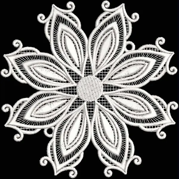This digital machine embroidery design features a symmetrical flower with intricate petal shapes and a central circular motif, all rendered in white against a contrasting background. Available in all hoop sizes.