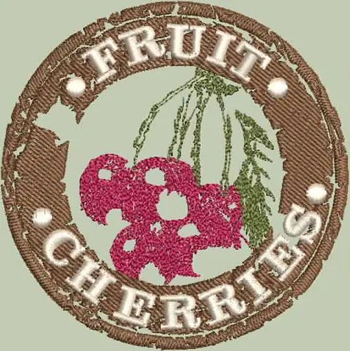 This digital machine embroidery design features cherries encircled by the words "FRUIT" and "CHERRIES." Available in all hoop sizes.
