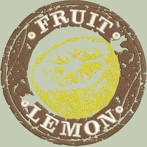 This digital machine embroidery design features a lemon slice featured in a circular badge with the words "FRUIT" and "LEMON" prominently displayed. Available in all hoop sizes.