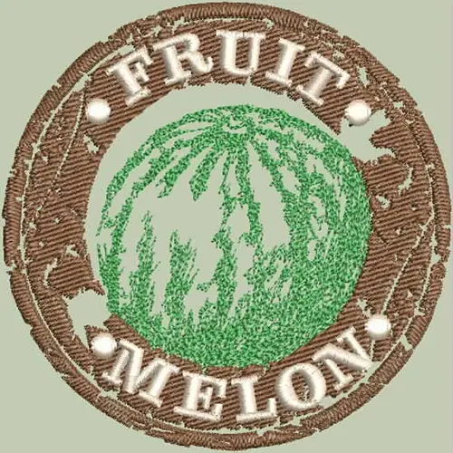 This embroidery design features a circular patch featuring a green watermelon with the words "FRUIT" and "MELON" prominently displayed. Available in all hoop sizes.