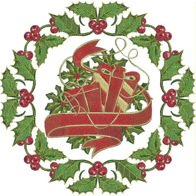 This digital machine embroidery design features wrapped gifts adorned with red ribbons, surrounded by holly leaves and berries. Available in all hoop sizes.