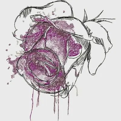 This embroidery design features a stylized rose with delicate linework and splashes of purple detail. Available in all hoop sizes.