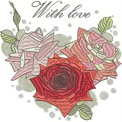 This embroidery design features three beautifully arranged roses in various shades, accompanied by the phrase "With love." Available in all hoop sizes.