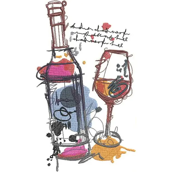 This digital machine embroidery design features a wine bottle and a wine glass, featuring artistic line work and color splashes that evoke a playful and contemporary style. Available in all hoop sizes.