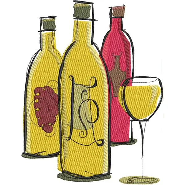 This digital machine embroidery design features three decorative wine bottles accompanied by a glass of wine, featuring playful colors and intricate patterns. Available in all hoop sizes.