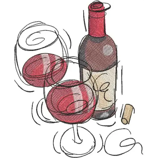 An embroidery design of a wine bottle accompanied by two glasses filled with red wine, featuring swirling lines to convey motion.