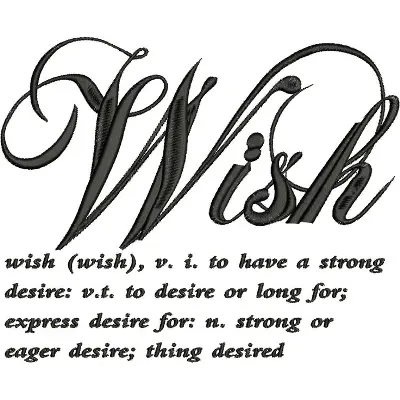 This embroidery design features the word "Wish" in elegant, flowing script accompanied by a definition and explanation of its meaning. Available in all hoop sizes.