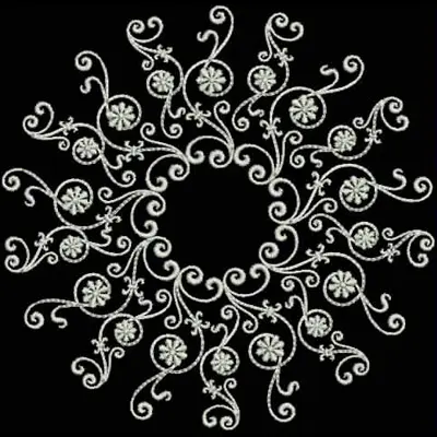 This digital machine embroidery design features an ornate floral circular pattern featuring swirling vines and blossoms. Available for 5X5 hoops.