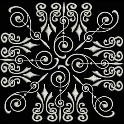 This digital machine embroidery design features intricate swirls and floral motifs arranged symmetrically with delicate detailing. Available for 5X5 hoops.