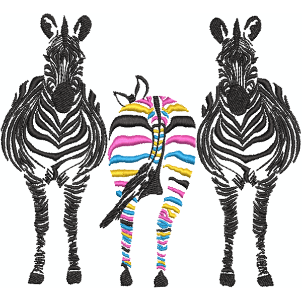 This digital machine embroidery design features two black zebras standing beside a colorful, striped zebra seen from the back. Available in all hoop sizes.
