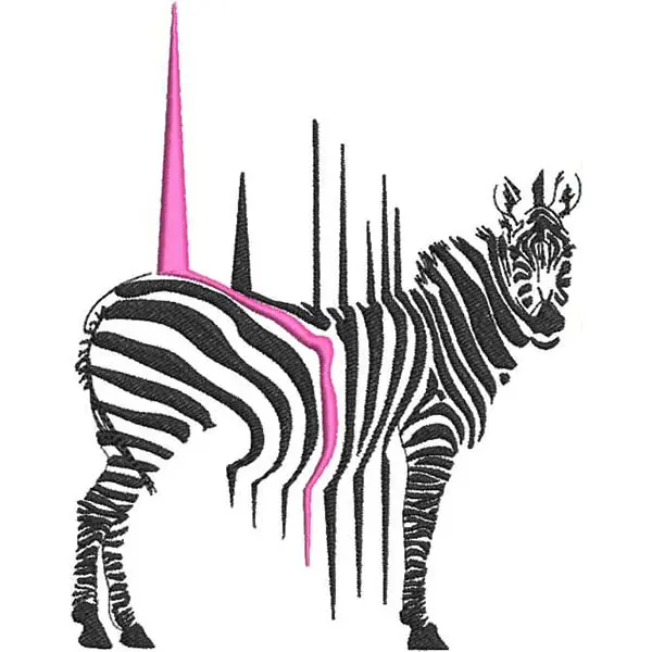 This digital machine embroidery design features a stylized zebra featuring black and white stripes with a striking pink accent. Available in all hoop sizes.