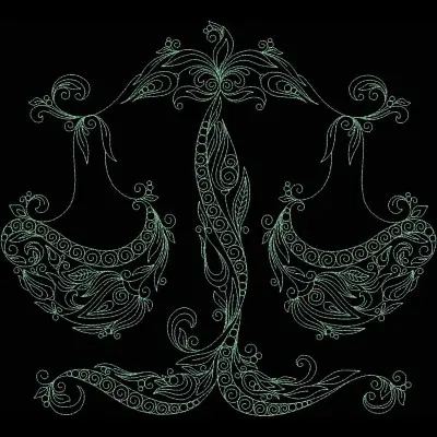 An embroidery design of a beautifully ornate set of scales, featuring intricate floral and swirling patterns.